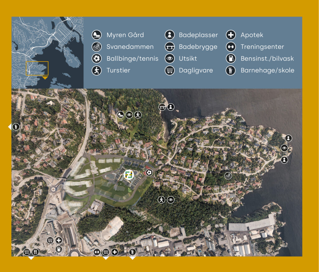 En kort sykkeltur fra Markens og noen meter fra nærbutikker, spisesteder og shopping. Lek og moro venter på Lumber, mens skogens ro lokker like utenfor døra. Avslutt dagen på vakre Myren gård og ta et kveldsbad fra en strand eller et svaberg. Fiskåtangen Fem er ikke bare et sted å bo, det er et sted å leve.